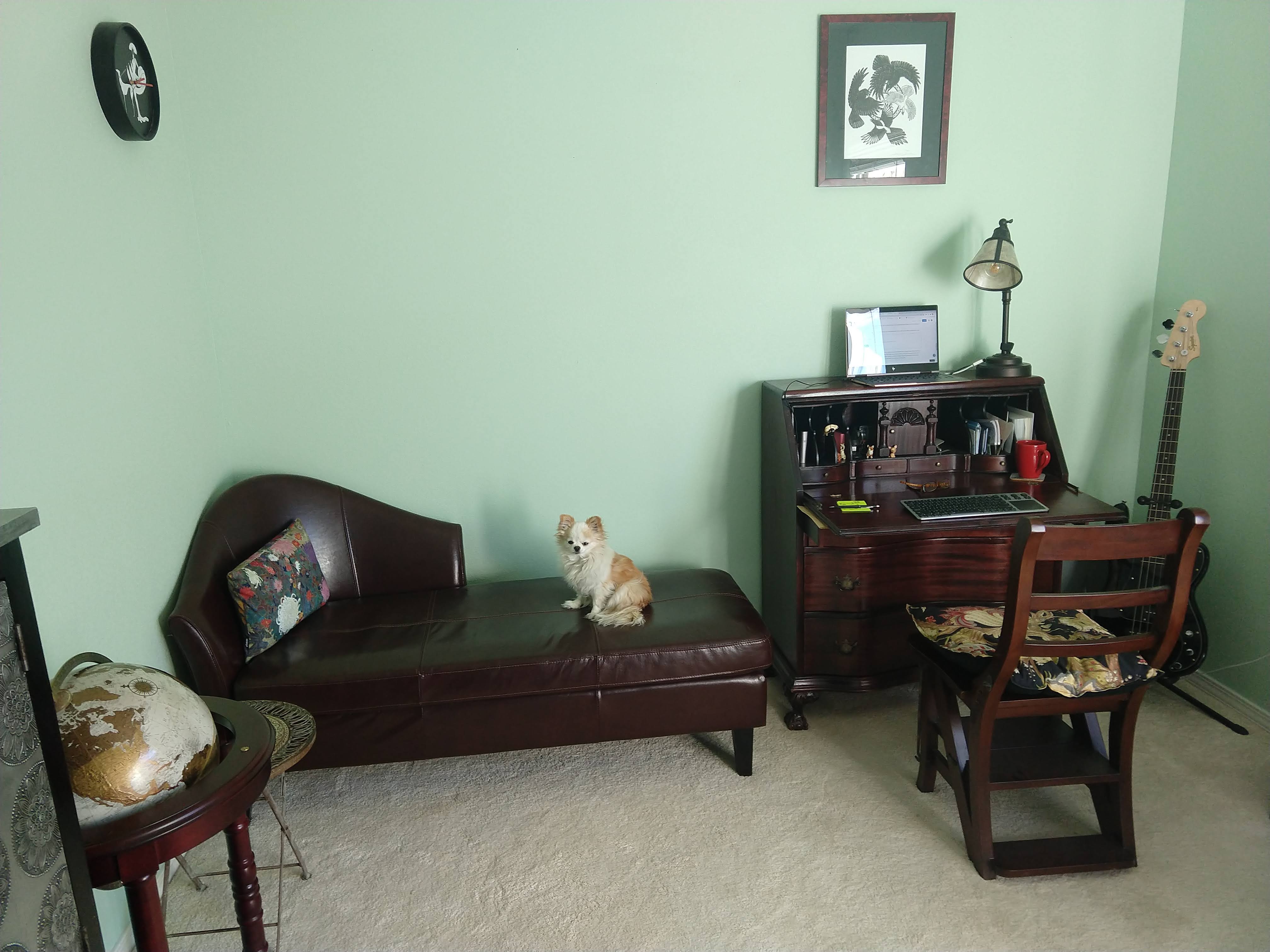 I accumulated these pieces of furniture over decades. Other than the desk and chair, none of them have been in the same room together before. The globe was a present from Joe’s work after being there for X amount of years.